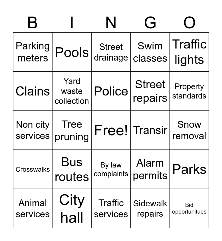 This bingo card has a free space and 29 words: Animal services, Bulky collection, Tree pruning, Dirty water, Parking meters, Street drainage, Yard waste collection, Bus routes, Transir, City hall, Snow removal, Bid opportunitues, Traffic services, Sidewalk repairs, Property standards, 911, By law complaints, Crosswalks, Traffic lights, Non city services, Alarm permits, Fence complaints, Street repairs, Clains, Swim classes, Pools, Parks, Police and Crime prevention.
