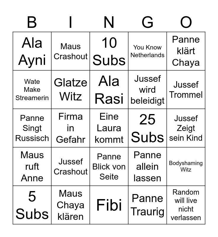 This bingo card has a free space and 24 words: Jussef Crashout, Maus Chaya klären, Ala Rasi, 5 Subs, Panne klärt Chaya, Ala Ayni, Wate Make Streamerin, Maus Crashout, 25 Subs, Panne Blick von Seite, Jussef wird beleidigt, Panne Singt Russisch, Panne allein lassen, Bodyshaming Witz, Glatze Witz, Panne Traurig, Jussef Zeigt sein Kind, 10 Subs, Jussef Trommel, Firma in Gefahr, Random will live nicht verlassen, Maus ruft Anne, You Know Netherlands and Fibi.