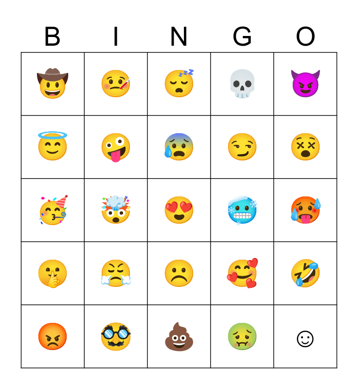 This bingo card has a free space and 24 words: π‘, π€, π°, π€’, π, π€ , π€, π΄, π₯Ά, π₯΅, π₯³, π€ͺ, π₯°, π€£, π, π₯Έ, π©, π, π΅, π€«, π€―, βΉοΈ, π and βΊοΈ.