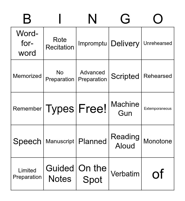 This bingo card has a free space and 24 words: Manuscript, Guided Notes, Advanced Preparation, Limited Preparation, Unrehearsed, Word-for-word, Memorized, Rote Recitation, Machine Gun, Planned, Scripted, Remember, Reading Aloud, Monotone, No Preparation, Verbatim, Extemporaneous, Impromptu, Rehearsed, Types, of, Speech, Delivery and On the Spot.