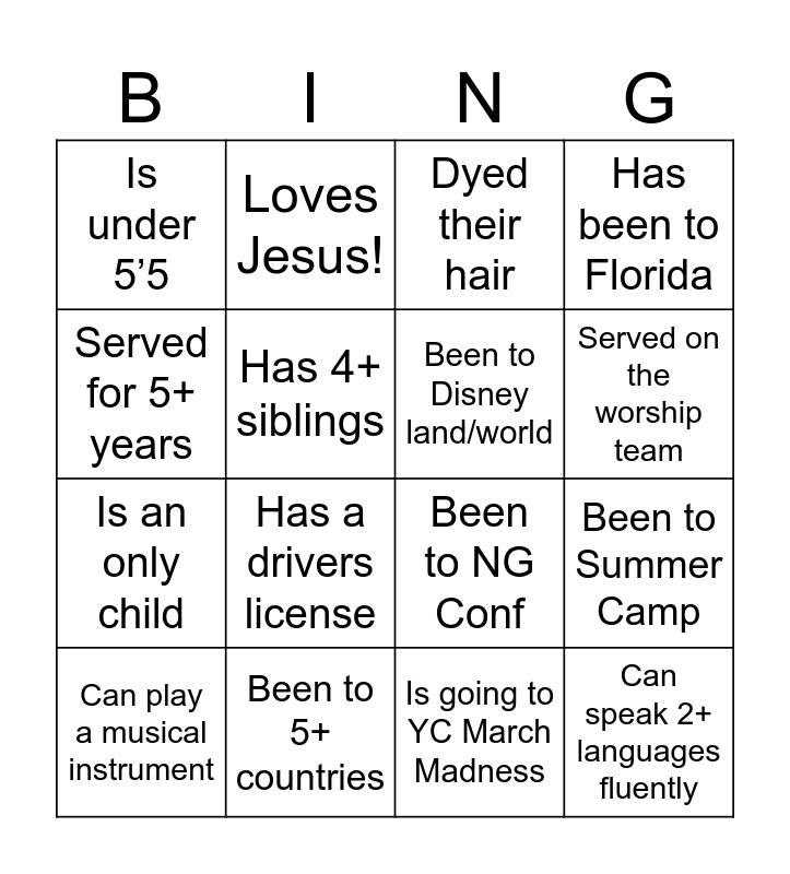 This bingo card has 20 words: Been to Summer Camp, Baked a cake, Dyed their hair, The same birth month as you, Can play a musical instrument, Served for 5+ years, Been to 5+ countries, Is under 5’5, Is an only child, Loves Jesus!, Has a drivers license, Been to NG Conf, Has 4+ siblings, Can speak 2+ languages fluently, Been to Disney land/world, Goes to college, Served on the worship team, Has been to Florida, Is going to YC March Madness and Has ran a marathon.