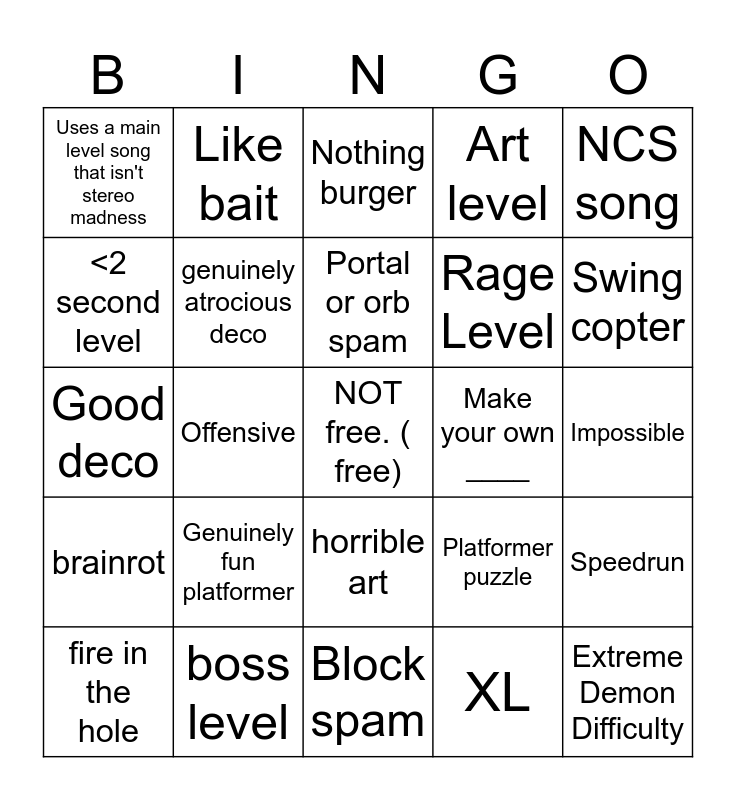 This bingo card has a free space and 24 words: fire in the hole, Genuinely fun platformer, Portal or orb spam, XL, NCS song, Uses a main level song that isn't stereo madness, Like bait, Nothing burger, Make your own ____, Impossible, Good deco, genuinely atrocious deco, Platformer puzzle, Speedrun, <2 second level, boss level, Block spam, Art level, Swing copter, brainrot, Offensive, horrible art, Rage Level and Extreme Demon Difficulty.