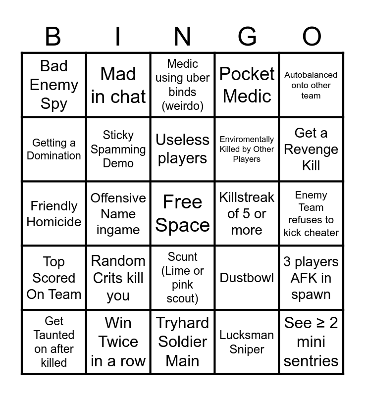 This bingo card has a free space and 49 words: W-M1 Pyro, See ≥ 2 mini sentries, Someone Stupid shooting at an Ubered player, Tryhard Soldier Main, Random Crits kill you, Die to / Get Taunt Kill, Mad in chat, ≥ 3 Spies / Snipers (not including Cheaters), Getting a Domination, Someone accidentally suicides off enviroment, Sticky Spamming Demo, Pocket Medic, 3 players AFK in spawn, Dustbowl, 75% of team is one class, ≥ 3 Engineers, Useless players, Killstreak of 5 or more, Gibbous / Pyrovision, Autobalanced onto other team, Offensive Name ingame, Lucksman Sniper, Bad Enemy Spy, Enviromentally Killed by Other Players, Someone On Mic, Get a Revenge Kill, Get Taunted on after killed, Pregame Joinable Taunts (At least 2 Players doing same taunt), Scunt (Lime or pink scout), Top Scored On Team, ≥ 3 players with Unusuals on either team, Spawn camping (In general - Either team), Pyro Refuses to extinguish teammate, Die in front of health kit, Win Twice in a row, Heavy being pushed by cart, Sentry nest containing ≥ 2 sentries, Win on overtime, Enemy Team refuses to kick cheater, Stupid Gibbous Engies, Elitist Sniper, Teammate or friend called out for cheats when not cheating, Heavy that actually heals teammates, Dinner, Friendly Homicide, Medic using uber binds (weirdo), Big Health pack stolen by player with more than 75% health, Someone Rage Quits and Teleporter Facing Wall.