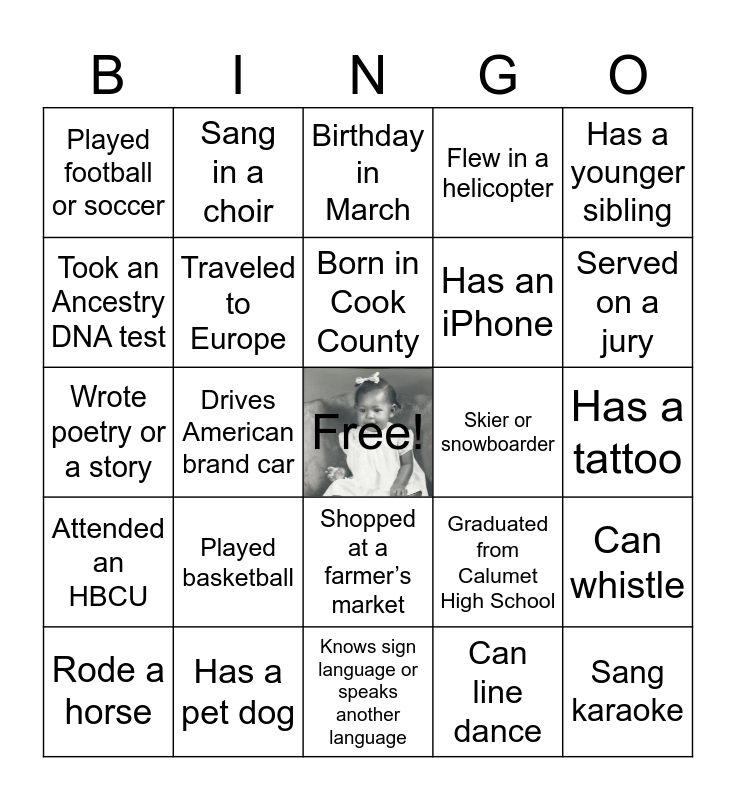 This bingo card has a free space and 36 words: Veteran, Medical professional, Traveled to Africa, Traveled to Europe, Graduated from Calumet High School, Attended an HBCU, Born in Cook County, Descendant of Atchinson and Katie Rollins, Has a younger sibling, Lives in a suburb of Chicago, Drives American brand car, Flew in a helicopter, Martial artist, Skier or snowboarder, Served on a jury, Played football or soccer, Plays a musical instrument, Played basketball, Sang karaoke, Birthday in March, Has a tattoo, Can whistle, Has a pet dog, Rode a horse, Knows sign language or speaks another language, Sang in a choir, Wrote poetry or a story, Visited a National Park or National Monument, Has an iPhone, Took an Ancestry DNA test, Attended a White Sox game, Has a garden, Can line dance, Shopped at a farmer’s market, Traveled to 5 or more states and Ancestors who lived in Meridian, Mississippi.