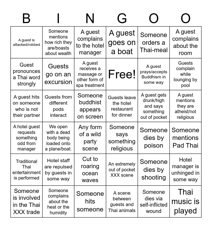 This bingo card has 36 words: An extremely out of pocket XXX scene, Cut to roaring ocean waves, A scene between guests and Thai animals, Guest pronounces a Thai word strongly, A hotel guest requests something odd from manager, Guests leave the hotel restaurant for dinner, Guests go on an excursion, Someone hits someone, Someone orders a Thai-meal, Someone dies by shooting, Guests complain while lounging by pool, A guest goes on a boat, Hotel manager is unhinged in some way, Guests from different pods interact, Free!, A guest is attacked/robbed, Traditional Thai entertainment is performed, A guest gets drunk/high and says something out of pocket, A guest hits on someone who is not their partner, A guest complains to the hotel manager, Someone buddhist appears on screen, We open with a dead body being loaded onto a plane/boat., Someone says something religious, Any form of a wild party scene, Someone dies by poison, Someone mentions how rich they are/boasts about wealth, A guest prays/accepts Buddhism in some way, Someone complains about the heat or the humidity, A guest receives a massage or other form of spa treatment, A guest complains about the room, Thai music is played, Someone is involved in the Thai XXX trade, Someone mentions Pad Thai, A guest mentions they are atheist/not religious, Hotel staff are repulsed by guests in some way and Someone dies via self-inflicted wound.