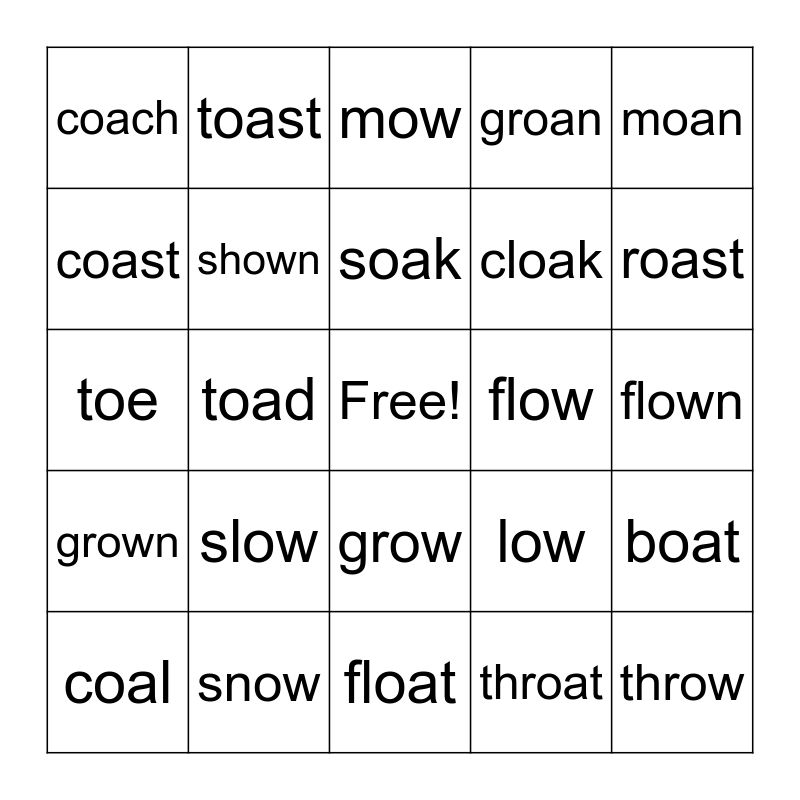 This bingo card has a free space and 29 words: coal, bowl, toad, poach, coach, mow, shown, slow, flow, snow, flown, throw, float, throat, roast, glow, grow, grown, moan, toe, low, boast, cloak, coast, groan, toast, boat, soak and oak.