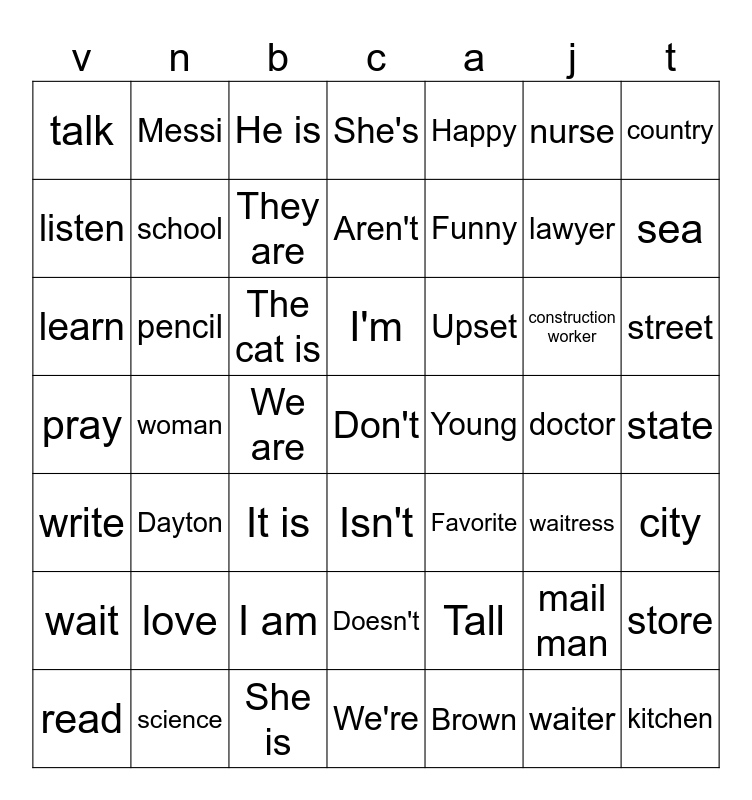 This bingo card has 49 words: wait, pencil, I am, Isn't, Upset, doctor, country, read, school, We are, Aren't, Happy, lawyer, street, write, Dayton, He is, I'm, Brown, nurse, sea, listen, Messi, They are, We're, Funny, construction worker, store, talk, woman, She is, Doesn't, Favorite, mail man, state, pray, love, It is, Don't, Young, waiter, city, learn, science, The cat is, She's, Tall, waitress and kitchen.