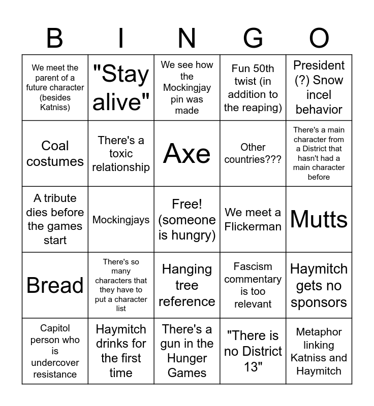This bingo card has a free space and 30 words: Haymitch drinks for the first time, We learn Katniss' mom's name, Mockingjays, Haymitch sings, We meet the parent of a future character (besides Katniss), We see how the Mockingjay pin was made, There's a toxic relationship, Hanging tree reference, We meet a Flickerman, There's a gun in the Hunger Games, Mutts, Metaphor linking Katniss and Haymitch, "There is no District 13", Avox lore, There's a main character from a District that hasn't had a main character before, Secondary character POV, Fascism commentary is too relevant, Bread, There's so many characters that they have to put a character list, President (?) Snow incel behavior, A tribute dies before the games start, Covey members are there, "Stay alive", Other countries???, Coal costumes, Fun 50th twist (in addition to the reaping), Haymitch gets no sponsors, Capitol person who is undercover resistance, Axe and Hung twinks.