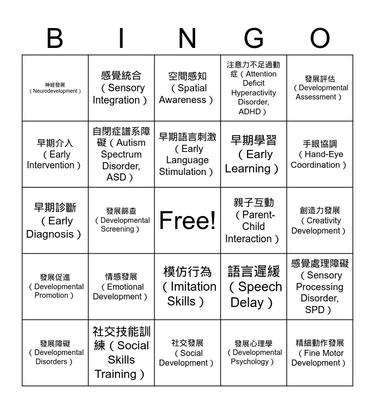 This bingo card has a free space and 50 words: 粗大動作發展(Gross Motor Development), 精細動作發展(Fine Motor Development), 語言發展(Language Development), 社交發展(Social Development), 情感發展(Emotional Development), 認知發展(Cognitive Development), 感覺統合(Sensory Integration), 發展里程碑(Developmental Milestones), 早期介入(Early Intervention), 發展遲緩(Developmental Delay), 自閉症譜系障礙(Autism Spectrum Disorder, ASD), 注意力不足過動症(Attention Deficit Hyperactivity Disorder, ADHD), 感覺處理障礙(Sensory Processing Disorder, SPD), 語言遲緩(Speech Delay), 動作協調障礙(Developmental Coordination Disorder, DCD), 社交溝通障礙(Social Communication Disorder), 早期語言刺激(Early Language Stimulation), 親子互動(Parent-Child Interaction), 遊戲治療(Play Therapy), 發展評估(Developmental Assessment), 發展篩查(Developmental Screening), 發展心理學(Developmental Psychology), 神經發展(Neurodevelopment), 早期學習(Early Learning), 感覺刺激(Sensory Stimulation), 動作計劃(Motor Planning), 手眼協調(Hand-Eye Coordination), 平衡能力(Balance Skills), 空間感知(Spatial Awareness), 模仿行為(Imitation Skills), 問題解決能力(Problem-Solving Skills), 記憶發展(Memory Development), 注意力發展(Attention Development), 情緒調節(Emotional Regulation), 社交技能訓練(Social Skills Training), 語言理解(Receptive Language), 語言表達(Expressive Language), 早期閱讀能力(Early Literacy Skills), 早期數學能力(Early Numeracy Skills), 創造力發展(Creativity Development), 自我照顧技能(Self-Care Skills), 獨立性培養(Independence Building), 同儕互動(Peer Interaction), 家庭支持(Family Support), 發展障礙(Developmental Disorders), 早期診斷(Early Diagnosis), 個別化教育計劃(Individualized Education Plan, IEP), 發展追蹤(Developmental Tracking), 發展促進(Developmental Promotion) and 發展適應(Developmental Adaptation).