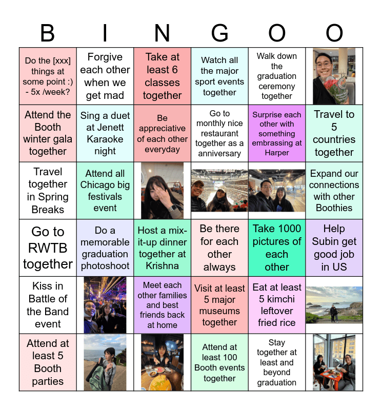This bingo card has 9 images and 27 words: Visit at least 5 major museums together, Meet each other families and best friends back at home, Attend at least 100 Booth events together, Attend the Booth winter gala together, Go to RWTB together, Sing a duet at Jenett Karaoke night, Walk down the graduation ceremony together, Eat at least 5 kimchi leftover fried rice, Travel to 5 countries together, Watch all the major sport events together, Attend all Chicago big festivals event, Go to monthly nice restaurant together as a anniversary, Do the [xxx] things at some point :) - 5x /week?, Kiss in Battle of the Band event, Travel together in Spring Breaks, Take at least 6 classes together, Do a memorable graduation photoshoot, Be there for each other always, Host a mix-it-up dinner together at Krishna, Take 1000 pictures of each other, Forgive each other when we get mad, Surprise each other with something embrassing at Harper, Be appreciative of each other everyday, Attend at least 5 Booth parties, Help Subin get good job in US, Expand our connections with other Boothies and Stay together at least and beyond graduation.