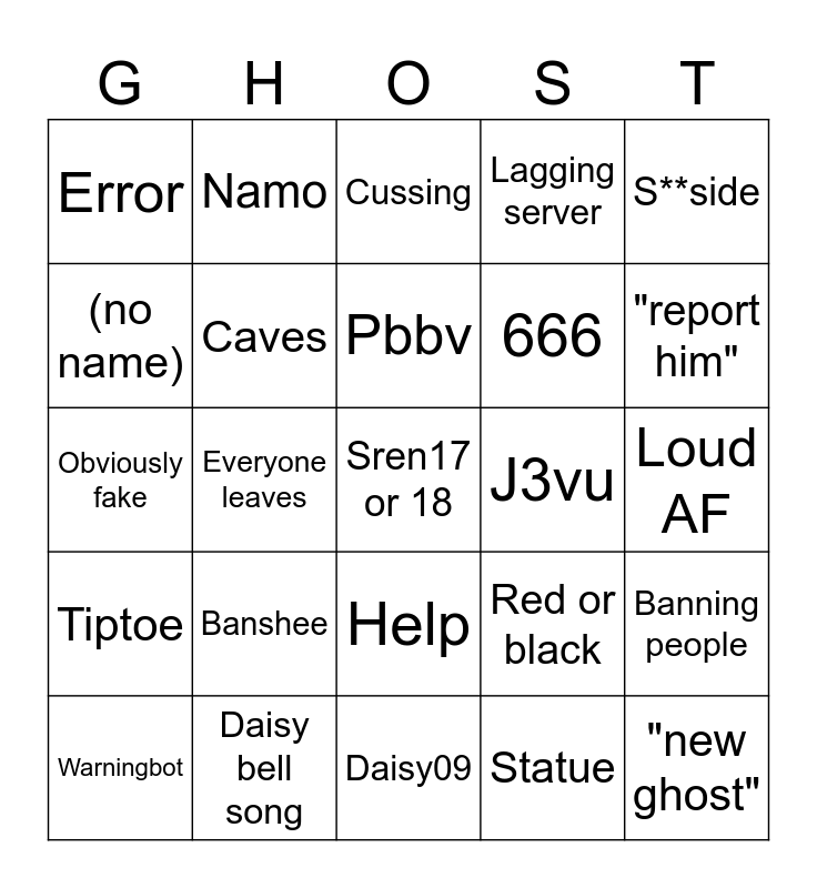 This bingo card has 25 words: Banshee, Daisy09, Pbbv, Warningbot, S**side, Error, (no name), Namo, J3vu, Help, 666, Obviously fake, Red or black, Banning people, Caves, "new ghost", Loud AF, Cussing, "report him", Everyone leaves, Sren17 or 18, Daisy bell song, Tiptoe, Lagging server and Statue.