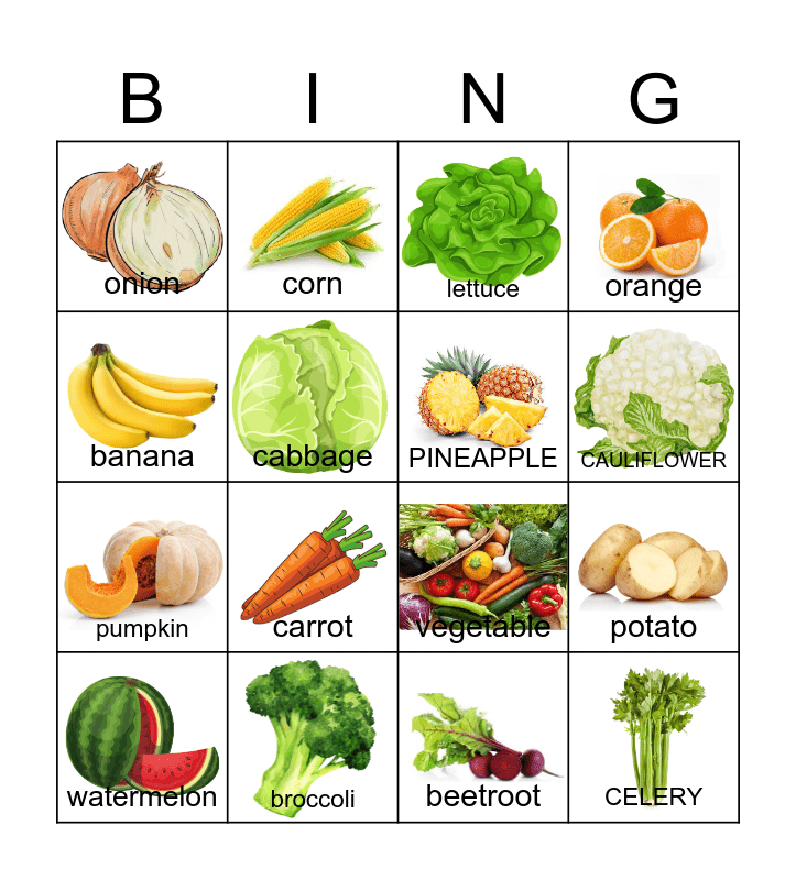 This bingo card has 16 images and 16 words: broccoli, potato, lettuce, onion, pumpkin, corn, vegetable, beetroot, banana, cabbage, watermelon, orange, carrot, CAULIFLOWER, PINEAPPLE and CELERY.