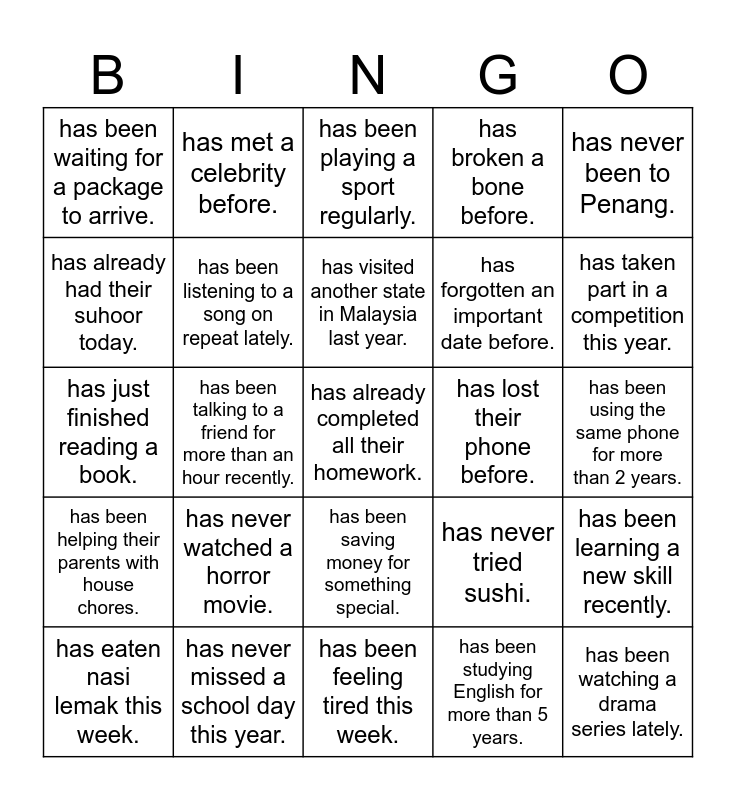 This bingo card has a free space and 24 words: has eaten nasi lemak this week., has never watched a horror movie., has visited another state in Malaysia last year., has been studying English for more than 5 years., has never been to Penang., has been waiting for a package to arrive., has met a celebrity before., has been playing a sport regularly., has lost their phone before., has been using the same phone for more than 2 years., has just finished reading a book., has been listening to a song on repeat lately., has never tried sushi., has been learning a new skill recently., has already had their suhoor today., has never missed a school day this year., has been feeling tired this week., has broken a bone before., has taken part in a competition this year., has been helping their parents with house chores., has been talking to a friend for more than an hour recently., has been saving money for something special., has forgotten an important date before. and has been watching a drama series lately..