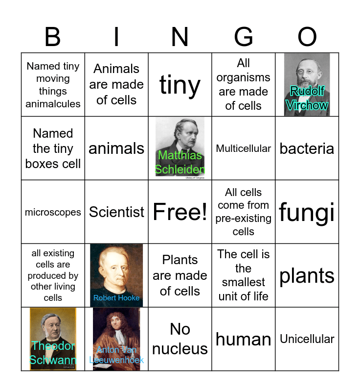 This bingo card has 5 images, a free space and 24 words: Robert Hooke, Anton Van Leeuwenhoek, Matthias Schleiden, Theodor Schwann, Rudolf Virchow, Named tiny moving things animalcules, Named the tiny boxes cell, Animals are made of cells, All cells come from pre-existing cells, Plants are made of cells, Multicellular, microscopes, The cell is the smallest unit of life, plants, animals, human, fungi, tiny, bacteria, Scientist, Unicellular, all existing cells are produced by other living cells, All organisms are made of cells and No nucleus.