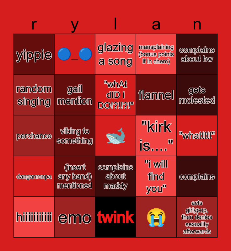 This bingo card has a free space and 24 words: (insert any band) mentioned, emo, "whAt dID i DO!?!!?!", hiiiiiiiiiii, complains about hw, yippie, random singing, 🔵_🔵, "kirk is....", complains about maddy, flannel, perchance, "i will find you", complains, gail mention, ðŸ˜, "whattttt", glazing a song, gets molested, vibing to something, acts girlypop, then denies sexuality afterwards, danganronpa, mansplaining (bonus points if in chem) and twink.