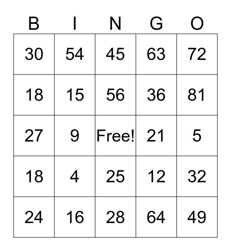 This bingo card has a free space and 24 words: 4, 16, 56, 24, 72, 30, 18, 54, 21, 25, 36, 27, 12, 32, 15, 64, 5, 45, 81, 9, 49, 18, 63 and 28.