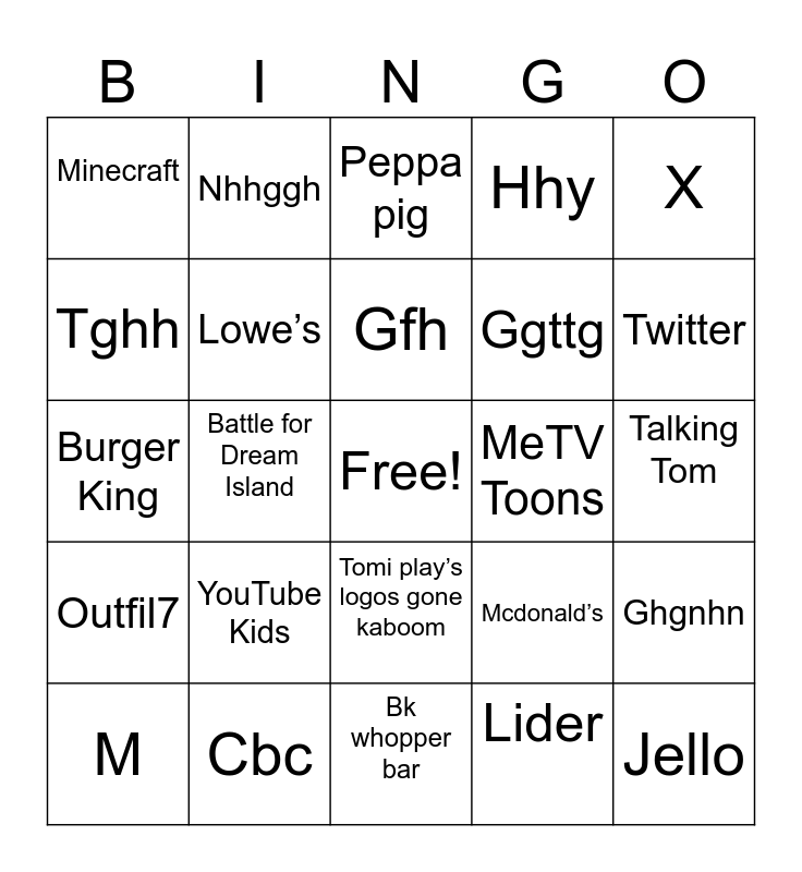 This bingo card has a free space and 29 words: M, Windows, Battle for Dream Island, Roblox, Minecraft, Peppa pig, Lowe’s, YouTube Kids, MeTV Toons, Cbc, Talking Tom, Jello, Bk whopper bar, Lider, Twitter, Tomi play, Tomi play’s logos gone kaboom, Outfil7, X, Burger King, Mcdonald’s, Pop UK, Ggttg, Tghh, Hhy, Nhhggh, Ghgnhn, Gfh and Fight.