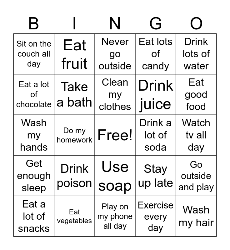 This bingo card has a free space and 24 words: Drink poison, Eat vegetables, Clean my clothes, Eat a lot of snacks, Drink lots of water, Sit on the couch all day, Eat a lot of chocolate, Eat fruit, Drink a lot of soda, Use soap, Drink juice, Wash my hands, Stay up late, Go outside and play, Take a bath, Exercise every day, Watch tv all day, Never go outside, Eat good food, Do my homework, Wash my hair, Get enough sleep, Eat lots of candy and Play on my phone all day.