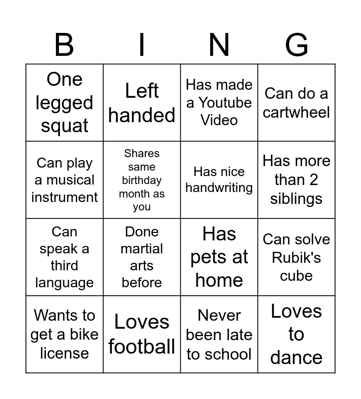 This bingo card has 16 words: Loves football, Can solve Rubik's cube, Has made a Youtube Video, One legged squat, Can speak a third language, Left handed, Has pets at home, Never been late to school, Can play a musical instrument, Shares same birthday month as you, Wants to get a bike license, Can do a cartwheel, Done martial arts before, Has more than 2 siblings, Has nice handwriting and Loves to dance.
