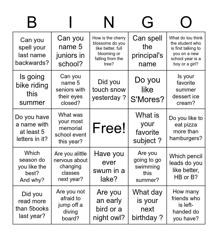 This bingo card has a free space and 24 words: Did you read more than 5books last year?, Are you alittle nervous about changing classes next year?, Did you touch snow yesterday ?, What day is your next birthday ?, What do tou think the student who is first talking to you on a new school year is a boy or a girl?, Can you spell your last name backwards?, Can you name 5 juniors in school?, How is the cherry blossoms do you like better, full blooming or falling from the tree?, What is your favorite subject ?, Do you like to eat pizza more than hamburgers?, Do you have a name with at least 5 letters in it?, Can you name 5 seniors with their eyes closed?, Are you going to go swimming this summer?, Which pencil leads do you like better, HB or B?, Is going bike riding this summer, Are you not afraid to jump off a diving board?, Are you an early bird or a night owl?, Can spell the principal's name, Is your favorite summer dessert ice cream?, Which season do you like the best? And why?, What was your most memorial school event this year?, Have you ever swum in a lake?, Do you like S'Mores? and How many friends who is left-handed do you have?.