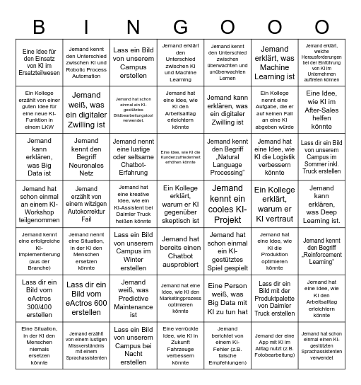This bingo card has a free space and 48 words: Eine Person weiß, was Big Data mit KI zu tun hat, Ein Kollege nennt eine Aufgabe, die er auf keinen Fall an eine KI abgeben würde, Eine verrückte Idee, wie KI in Zukunft Fahrzeuge verbessern könnte, Jemand erzählt von einem witzigen Autokorrektur Fail, Jemand nennt eine lustige oder seltsame Chatbot-Erfahrung, Jemand kann erklären, was Deep Learning ist., Jemand kennt den Unterschied zwischen KI und Robotic Process Automation, Jemand erzählt von einem lustigen Missverständnis mit einem Sprachassistenten, Jemand erklärt, was Machine Learning ist, Jemand hat bereits einen Chatbot ausprobiert, Jemand erklärt, welche Herausforderungen bei der Einführung von KI im Unternehmen auftreten können, Jemand erklärt den Unterschied zwischen KI und Machine Learning, Jemand hat eine Idee, wie KI die Logistik verbessern könnte, Jemand kennt den Begriff „Natural Language Processing“, Lass dir ein Bild vom eActros 300/400 erstellen, Ein Kollege erklärt, warum er KI vertraut, Ein Kollege erzählt von einer guten Idee für eine neue KI-Funktion in einem LKW, Eine Idee, wie KI im After-Sales helfen könnte, Lass dir ein Bild mit der Produktpalette von Daimler Truck erstellen, Jemand kennt den Unterschied zwischen überwachten und unüberwachten Lernen, Jemand kann erklären, was ein digitaler Zwilling ist, Jemand hat eine kreative Idee, wie ein KI-Assistent bei Daimler Truck heißen könnte, Eine Idee für den Einsatz von KI im Ersatzteilwesen, Jemand weiß, was ein digitaler Zwilling ist, Jemand hat eine Idee, wie KI den Arbeitsalltag erleichtern könnte, Jemand hat schon einmal ein KI-gestütztes Bildbearbeitungstool verwendet., Lass dir ein Bild von unserem Campus im Sommer inkl. Truck erstellen, Eine Situation, in der KI den Menschen niemals ersetzen könnte, Eine Idee, wie KI die Kundenzufriedenheit erhöhen könnte, Jemand kennt den Begriff Neuronales Netz, Jemand der eine App mit KI im Alltag nutzt (z.B. Fotobearbeitung), Jemand kennt ein cooles KI-Projekt, Jemand kennt den Begriff „Reinforcement Learning“, Lass dir ein Bild vom eActros 600 erstellen, Jemand hat schon einmal an einem KI-Workshop teilgenommen, Jemand hat schon einmal ein KI-gestütztes Spiel gespielt, Jemand hat eine Idee, wie KI die Produktion optimieren könnte, Jemand kann erklären, was Big Data ist, Lass ein Bild von unserem Campus im Winter erstellen, Jemand weiß, was Predictive Maintenance ist, Jemand kennt eine erfolgreiche KI-Implementierung (aus der Branche), Jemand hat schon einmal einen KI-gestützten Sprachassistenten verwendet, Lass ein Bild von unserem Campus erstellen, Lass ein Bild von unserem Campus bei Nacht erstellen, Jemand hat eine Idee, wie KI den Arbeitsalltag erleichtern könnte, Jemand hat eine Idee, wie KI den Marketingprozess optimieren könnte, Jemand nennt eine Situation, in der KI den Menschen ersetzen könnte and Jemand berichtet von einem KI-Fehler (z.B. falsche Empfehlungen).