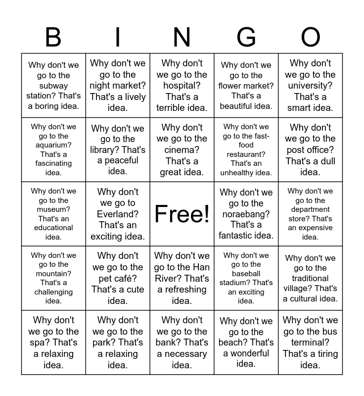 This bingo card has a free space and 30 words: Why don't we go to the park? That's a relaxing idea., Why don't we go to the convenience store? That's a quick idea., Why don't we go to Everland? That's an exciting idea., Why don't we go to the PC방? That's a fun idea., Why don't we go to the subway station? That's a boring idea., Why don't we go to the hospital? That's a terrible idea., Why don't we go to the library? That's a peaceful idea., Why don't we go to the Han River? That's a refreshing idea., Why don't we go to the noraebang? That's a fantastic idea., Why don't we go to the bank? That's a necessary idea., Why don't we go to the department store? That's an expensive idea., Why don't we go to the bus terminal? That's a tiring idea., Why don't we go to the beach? That's a wonderful idea., Why don't we go to the palace? That's an interesting idea., Why don't we go to the post office? That's a dull idea., Why don't we go to the amusement park? That's a thrilling idea., Why don't we go to the baseball stadium? That's an exciting idea., Why don't we go to the mountain? That's a challenging idea., Why don't we go to the pet café? That's a cute idea., Why don't we go to the university? That's a smart idea., Why don't we go to the museum? That's an educational idea., Why don't we go to the shopping mall? That's a crowded idea., Why don't we go to the night market? That's a lively idea., Why don't we go to the fast-food restaurant? That's an unhealthy idea., Why don't we go to the aquarium? That's a fascinating idea., Why don't we go to the flower market? That's a beautiful idea., Why don't we go to the traditional village? That's a cultural idea., Why don't we go to the spa? That's a relaxing idea., Why don't we go to the cinema? That's a great idea. and Why don't we go to the zoo? That's a smelly idea..