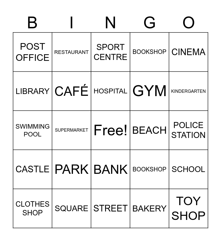 This bingo card has a free space and 24 words: PARK, SQUARE, HOSPITAL, CLOTHES SHOP, CINEMA, POST OFFICE, LIBRARY, RESTAURANT, BEACH, BANK, GYM, SWIMMING POOL, BOOKSHOP, SCHOOL, CAFÉ, BAKERY, POLICE STATION, SPORT CENTRE, KINDERGARTEN, SUPERMARKET, TOY SHOP, CASTLE, BOOKSHOP and STREET.