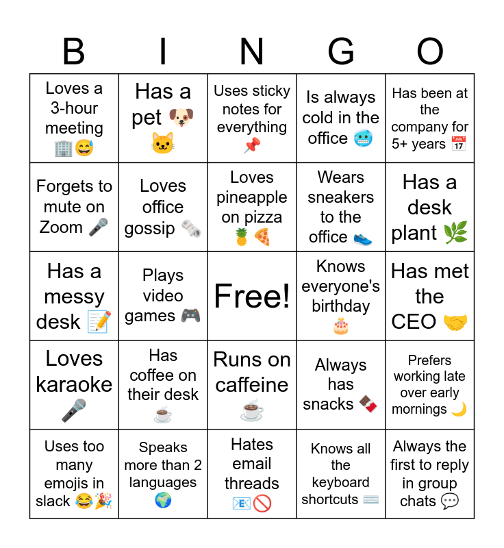 This bingo card has a free space and 24 words: Has coffee on their desk â, Speaks more than 2 languages đ, Loves pineapple on pizza đđ, Uses too many emojis in slack đđ, Has been at the company for 5+ years đ , Loves a 3-hour meeting đĸđ , Forgets to mute on Zoom đ¤, Has a pet đļđą, Knows everyone's birthday đ, Runs on caffeine â, Wears sneakers to the office đ, Has a messy desk đ, Always has snacks đĢ, Prefers working late over early mornings đ, Loves office gossip đī¸, Knows all the keyboard shortcuts â¨ī¸, Has met the CEO đ¤, Uses sticky notes for everything đ, Has a desk plant đŋ, Plays video games đŽ, Always the first to reply in group chats đŦ, Loves karaoke đ¤, Is always cold in the office đĨļ and Hates email threads đ§đĢ.
