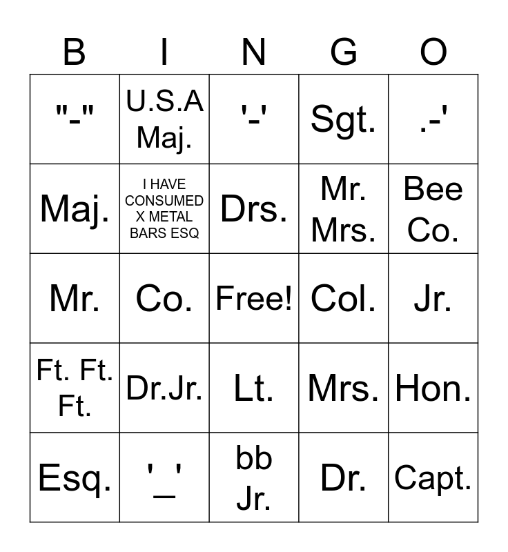 This bingo card has a free space and 24 words: Dr.Jr., '_', Drs., Esq., .-', "-", Maj., U.S.A Maj., Col., Lt., Mr. Mrs., Mr., Mrs., Hon., I HAVE CONSUMED X METAL BARS ESQ, Dr., Jr., '-', Bee Co., Co., Capt., Ft. Ft. Ft., Sgt. and bb Jr..