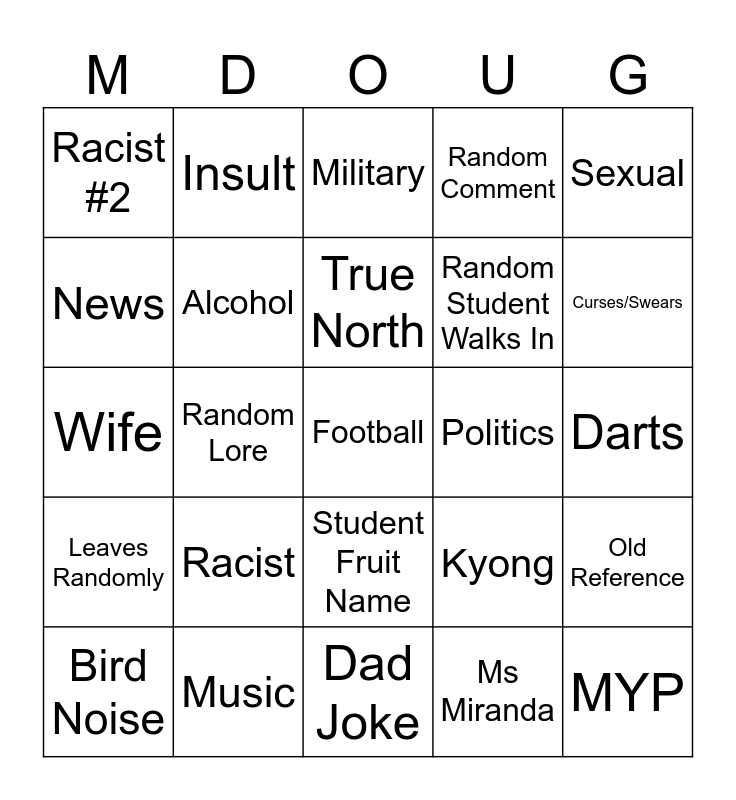 This bingo card has a free space and 24 words: Racist, Music, True North, Bird Noise, Sexual, Racist #2, News, Insult, Politics, Student Fruit Name, Random Student Walks In, Wife, Kyong, Old Reference, Alcohol, Ms Miranda, Darts, Military, Curses/Swears, Random Lore, MYP, Leaves Randomly, Random Comment and Dad Joke.