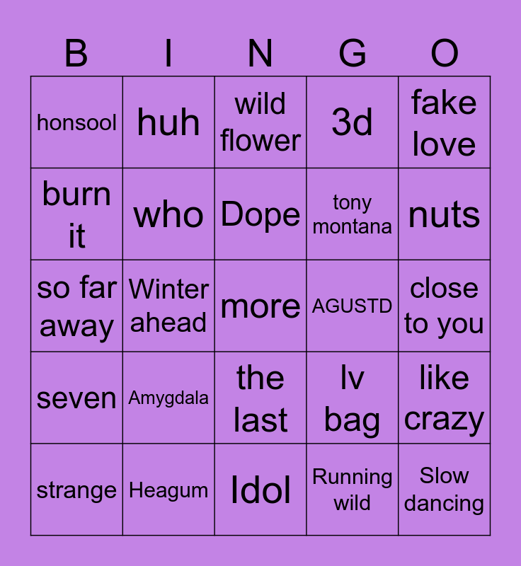 This bingo card has a free space and 24 words: Amygdala, Heagum, Dope, strange, fake love, honsool, burn it, huh, AGUSTD, the last, tony montana, so far away, lv bag, like crazy, who, Running wild, close to you, wild flower, nuts, Winter ahead, Slow dancing, seven, 3d and Idol.