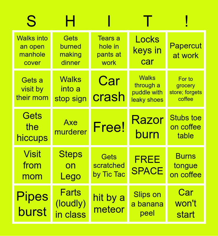 This bingo card has a free space and 25 words: Steps on Lego, hit by a meteor, Car crash, Pipes burst, Papercut at work, Walks into an open manhole cover, Gets a visit by their mom, Gets burned making dinner, Razor burn, Gets scratched by Tic Tac, Walks through a puddle with leaky shoes, Gets the hiccups, FREE SPACE, Burns tongue on coffee, Walks into a stop sign, Pulls a muscle, Stubs toe on coffee table, Tears a hole in pants at work, For to grocery store; forgets coffee, Axe murderer, Car won't start, Farts (loudly) in class, Visit from mom, Locks keys in car and Slips on a banana peel.
