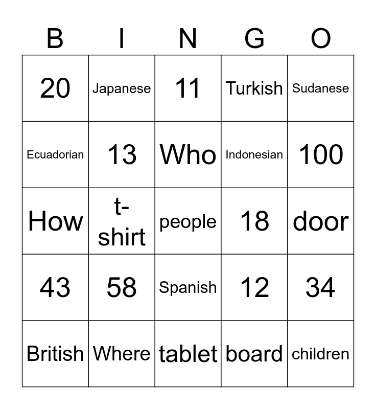 This bingo card has 31 words: tablet, airport, t-shirt, 33, 20, 11, 13, 12, 18, board, door, people, children, women, 100, 87, 34, 58, 43, Spanish, Sudanese, American, British, Japanese, Indonesian, Ecuadorian, Turkish, How, Where, Who and Why.
