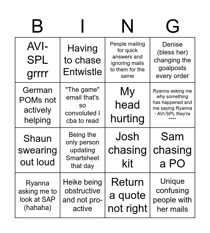 This bingo card has 16 words: Heike being obstructive and not pro-active, Sam chasing a PO, People mailing for quick answers and ignoring mails to them for the same, AVI-SPL grrrr, Shaun swearing out loud, Having to chase Entwistle, Josh chasing kit, Return a quote not right, German POMs not actively helping, "The game" email that's so convoluted I cba to read, Ryanna asking me to look at SAP (hahaha), Denise (bless her) changing the goalposts every order, Being the only person updating Smartsheet that day, Ryanna asking me why something has happened and me saying Ryanna - AVI-SPL they're ****, My head hurting and Unique confusing people with her mails.