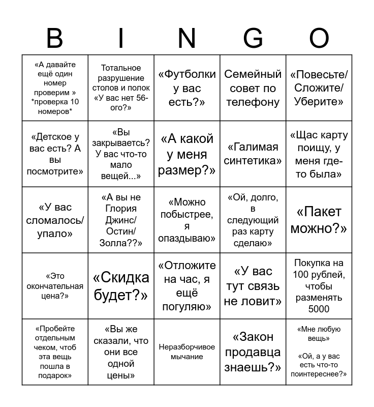 This bingo card has a free space and 24 words: «Скидка будет?», «Вы же сказали, что они все одной цены», «А какой у меня размер?», «Пробейте отдельным чеком, чтоб эта вещь пошла в подарок», «Повесьте/ Сложите/ Уберите», «А давайте ещё один номер проверим » *проверка 10 номеров*, «Детское у вас есть? А вы посмотрите», Тотальное разрушение столов и полок «У вас нет 56-ого?», «Ой, долго, в следующий раз карту сделаю», «Отложите на час, я ещё погуляю», «Галимая синтетика», «У вас сломалось/упало», «У вас тут связь не ловит», Покупка на 100 рублей, чтобы разменять 5000, «Вы закрываетсь? У вас что-то мало вещей...», «Закон продавца знаешь?», «Пакет можно?», «Футболки у вас есть?», «Щас карту поищу, у меня где-то была», «А вы не Глория Джинс/ Остин/ Золла??», «Мне любую вещь» «Ой, а у вас есть что-то поинтереснее?», «Это окончательная цена?», Семейный совет по телефону and Неразборчивое мычание.