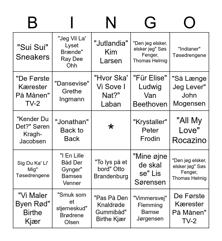 This bingo card has a free space and 24 words: "I En Lille Båd Der Gynger" Bamses Venner, "Smuk som et stjerneskud" Brødrene Olsen, "Hvor Ska' Vi Sove I Nat?" Laban, "Vi Maler Byen Rød" Birthe Kjær, "Indianer" Tøsedrengene, "Sui Sui" Sneakers, "De Første Kærester På Månen" TV-2, "Jeg Vil La' Lyset Brænde" Ray Dee Ohh, "Krystaller" Peter Frodin, "To lys på et bord" Otto Brandenburg, "Für Elise" Ludwig Van Beethoven, "Kender Du Det?" Søren Kragh-Jacobsen, "Mine øjne de skal se" Lis Sørensen, "Den jeg elsker, elsker jeg" Søs Fenger, Thomas Helmig, "Dansevise" Grethe Ingmann, "Vimmersvej" Flemming Bamse Jørgensen, "All My Love" Rocazino, "Jutlandia" Kim Larsen, "Så Længe Jeg Lever" John Mogensen, "Jonathan" Back to Back, De Første Kærester På Månen" TV-2, Sig Du Ka' Li' Mig" Tøsedrengene, "Den jeg elsker, elsker jeg" Søs Fenger, Thomas Helmig and "Pas På Den Knaldrøde Gummibåd" Birthe Kjær.