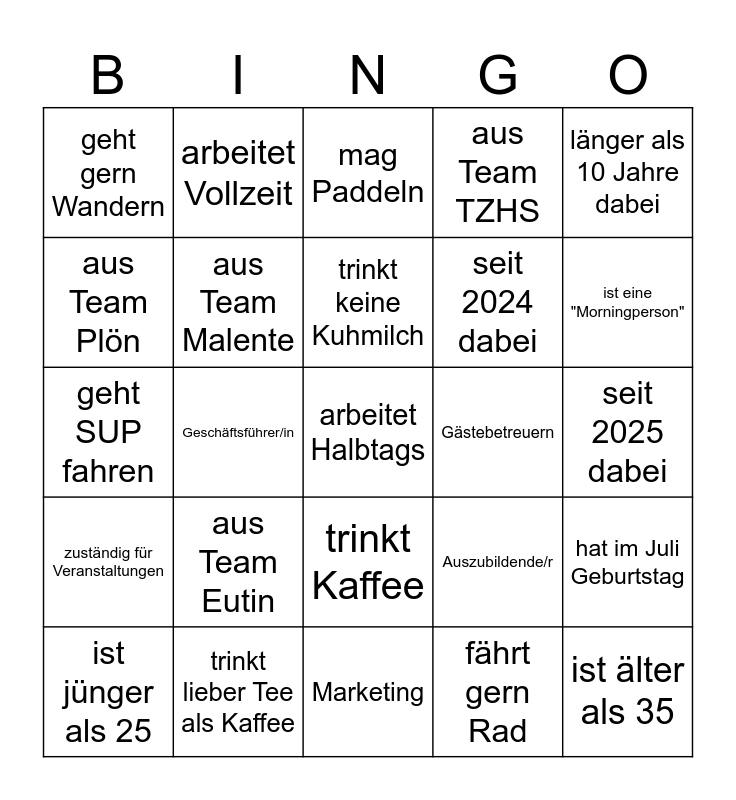 This bingo card has 25 words: aus Team Eutin, Marketing, trinkt keine Kuhmilch, ist jünger als 25, länger als 10 Jahre dabei, geht gern Wandern, aus Team Plön, arbeitet Vollzeit, Gästebetreuern, trinkt Kaffee, seit 2024 dabei, geht SUP fahren, Auszubildende/r, hat im Juli Geburtstag, aus Team Malente, ist älter als 35, seit 2025 dabei, mag Paddeln, ist eine "Morningperson", Geschäftsführer/in, arbeitet Halbtags, trinkt lieber Tee als Kaffee, zuständig für Veranstaltungen, aus Team TZHS and fährt gern Rad.