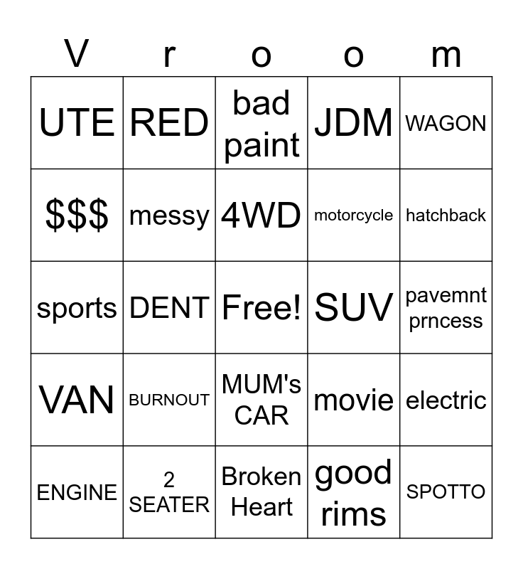 This bingo card has a free space and 24 words: BURNOUT, 2 SEATER, 4WD, ENGINE, WAGON, UTE, $$$, RED, SUV, MUM's CAR, motorcycle, sports, movie, electric, messy, good rims, pavemnt prncess, bad paint, hatchback, DENT, SPOTTO, VAN, JDM and Broken Heart.