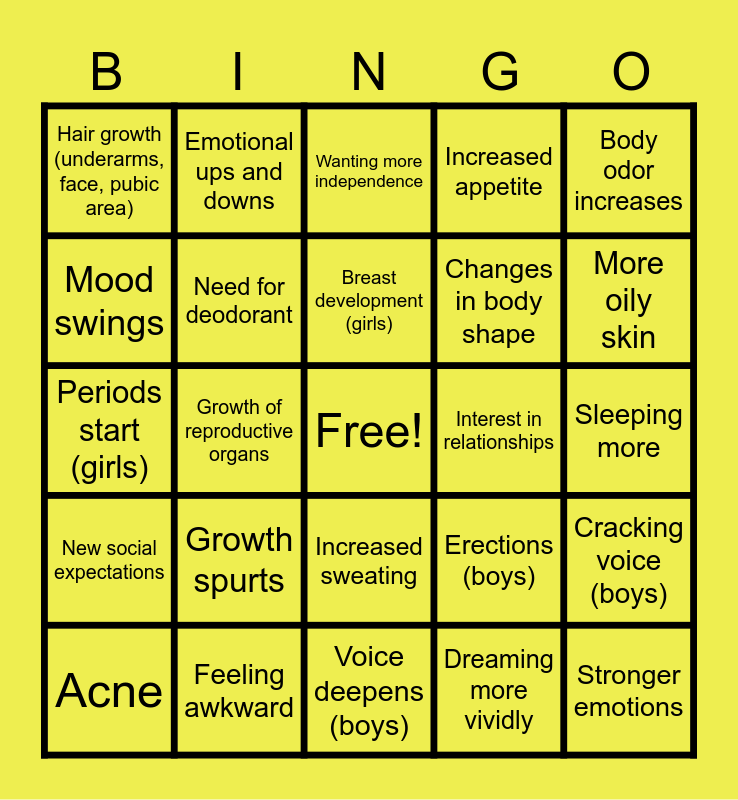 This bingo card has a free space and 25 words: Growth spurts, Voice deepens (boys), Breast development (girls), Acne, Body odor increases, Hair growth (underarms, face, pubic area), Mood swings, Emotional ups and downs, Interest in relationships, Increased sweating, Changes in body shape, Periods start (girls), Erections (boys), Cracking voice (boys), Need for deodorant, Feeling self-conscious, Sleeping more, Wanting more independence, More oily skin, Growth of reproductive organs, Stronger emotions, Feeling awkward, New social expectations, Increased appetite and Dreaming more vividly.