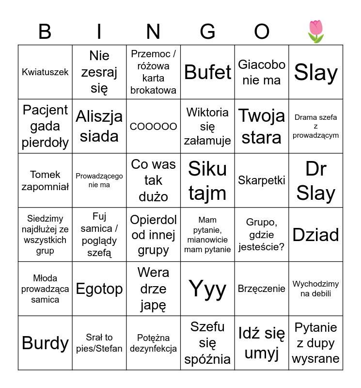 This bingo card has 36 words: Yyy, Wera drze japę, Szefu się spóźnia, Pacjent gada pierdoły, Siedzimy najdłużej ze wszystkich grup, Siku tajm, Aliszja siada, Potężna dezynfekcja, Giacobo nie ma, Brzęczenie, Drama szefa z prowadzącym, Bufet, Wychodzimy na debili, Prowadzącego nie ma, Wiktoria się załamuje, Kwiatuszek, Młoda prowadząca samica, Skarpetki, Tomek zapomniał, Przemoc / różowa karta brokatowa, Co was tak dużo, Fuj samica / poglądy szefą, Mam pytanie, mianowicie mam pytanie, Opierdol od innej grupy, Grupo, gdzie jesteście?, Nie zesraj się, Twoja stara, Srał to pies/Stefan, COOOOO, Slay, Pytanie z dupy wysrane, Burdy, Dziad, Dr Slay, Egotop and Idź się umyj.