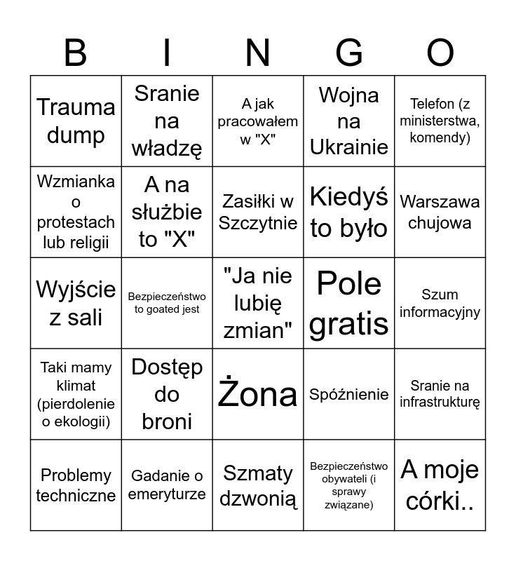 This bingo card has 25 words: Dostęp do broni, Szmaty dzwonią, Zasiłki w Szczytnie, Problemy techniczne, Telefon (z ministerstwa, komendy), Trauma dump, Wzmianka o protestach lub religii, Sranie na władzę, Pole gratis, Żona, Kiedyś to było, Wyjście z sali, Spóźnienie, Sranie na infrastrukturę, A na służbie to "X", A moje córki.., Szum informacyjny, A jak pracowałem w "X", Warszawa chujowa, Bezpieczeństwo to goated jest, "Ja nie lubię zmian", Gadanie o emeryturze, Taki mamy klimat (pierdolenie o ekologii), Wojna na Ukrainie and Bezpieczeństwo obywateli (i sprawy związane).