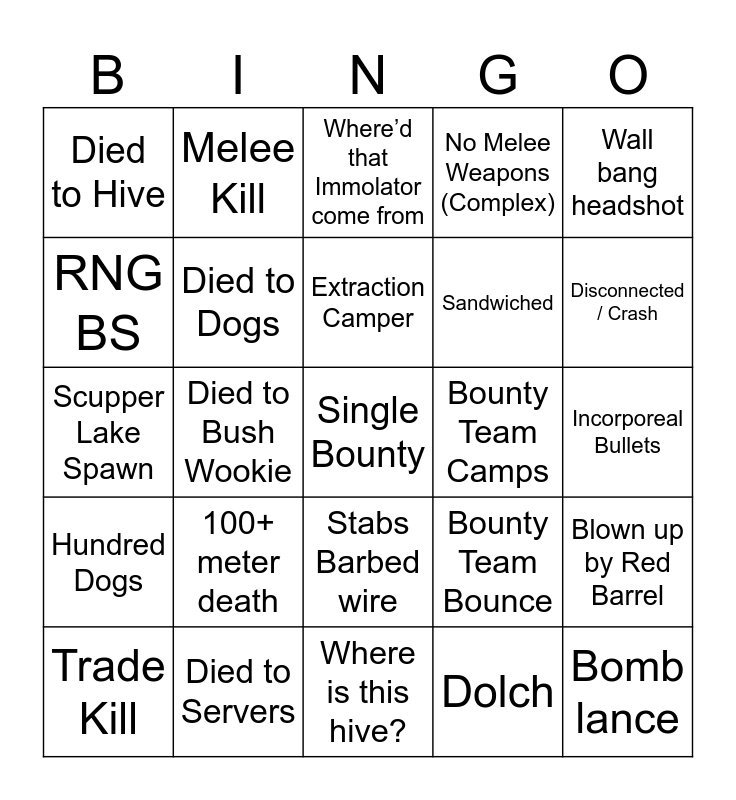 This bingo card has a free space and 30 words: Died to Servers, Penny Shots, Died to Bush Wookie, Totally a Hacker, Died to Hive, Where’d that Immolator come from, Died to Dogs, Stabs Barbed wire, Bounty Team Camps, Where is this hive?, Incorporeal Bullets, Bomb lance, Dolch, AI Apocalypse, Disconnected / Crash, Server Wipe, Bounty Team Bounce, Hundred Dogs, 100+ meter death, Wall bang headshot, Scupper Lake Spawn, Nitro / Specter, Melee Kill, Sandwiched, RNG BS, No Melee Weapons (Complex), Blown up by Red Barrel, Trade Kill, Extraction Camper and 180 Bounty Spawn.