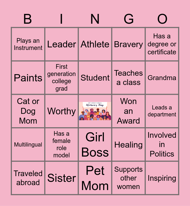 This bingo card has a free space and 29 words: Mom, Sister, Athlete, Queen, Has a degree or certificate, Plays an Instrument, First generation college grad, Student, Won an Award, Involved in Politics, Traveled abroad, Worthy, Supports other women, Inspiring, Cat or Dog Mom, Self Love, Pet Mom, Healing, Grandma, Multilingual, Has a female role model, Awesome aunt, Teaches a class, Leads a department, Paints, Leader, Girl Boss, Bravery and Strength.