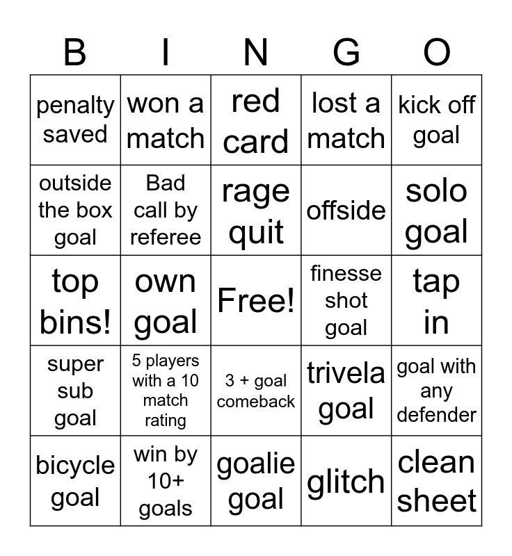 This bingo card has a free space and 24 words: bicycle goal, 5 players with a 10 match rating, rage quit, glitch, kick off goal, penalty saved, won a match, red card, finesse shot goal, tap in, top bins!, Bad call by referee, trivela goal, goal with any defender, outside the box goal, win by 10+ goals, goalie goal, lost a match, solo goal, super sub goal, own goal, 3 + goal comeback, offside and clean sheet.