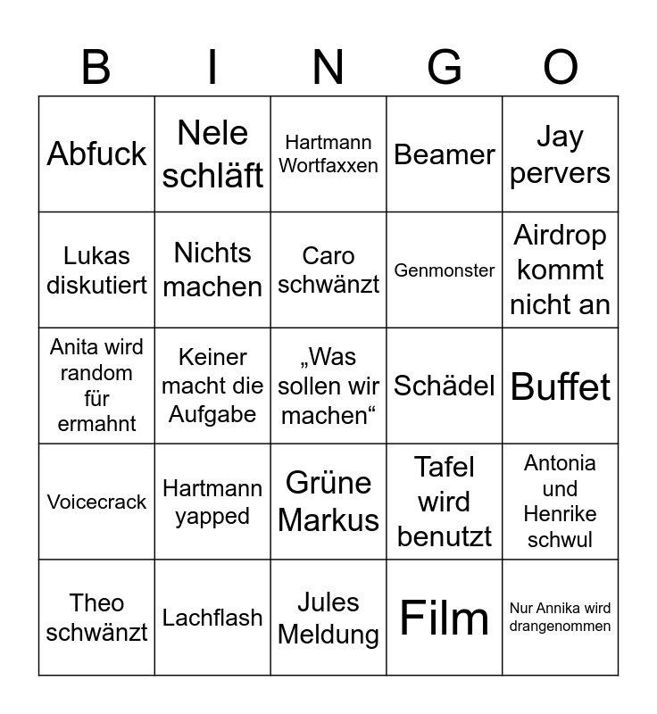 This bingo card has 25 words: Hartmann yapped, Jules Meldung, Caro schwänzt, Theo schwänzt, Jay pervers, Abfuck, Lukas diskutiert, Nele schläft, Schädel, Grüne Markus, Genmonster, Anita wird random für ermahnt, Tafel wird benutzt, Antonia und Henrike schwul, Nichts machen, Nur Annika wird drangenommen, Buffet, Hartmann Wortfaxxen, Airdrop kommt nicht an, Keiner macht die Aufgabe, „Was sollen wir machen“, Lachflash, Voicecrack, Beamer and Film.
