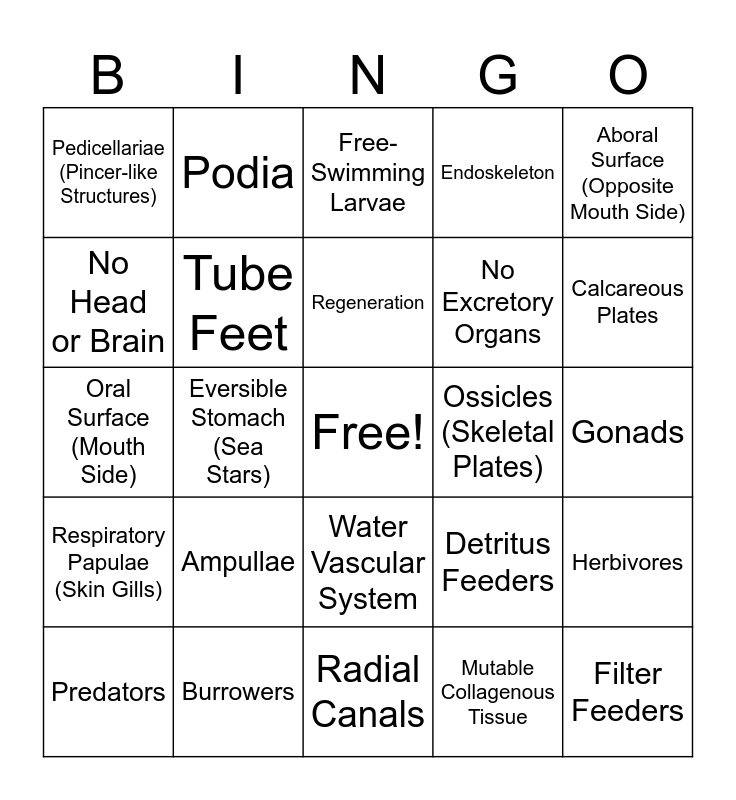 This bingo card has a free space and 35 words: Marine Animals, Spiny Skin, Five-Part Radial Symmetry (Pentaradial), Tube Feet, Water Vascular System, Endoskeleton, No Head or Brain, Slow-Moving, Regeneration, Deuterostome Development, Oral Surface (Mouth Side), Aboral Surface (Opposite Mouth Side), Madreporite (Water Intake), Ambulacral Grooves, Pedicellariae (Pincer-like Structures), Ossicles (Skeletal Plates), Mutable Collagenous Tissue, Eversible Stomach (Sea Stars), Respiratory Papulae (Skin Gills), Filter Feeders, Detritus Feeders, Predators, Herbivores, Burrowers, Free-Swimming Larvae, Calcareous Plates, Spines, Arms, No Excretory Organs, Gonads, Ring Canal, Radial Canals, Ampullae, Podia and Nerve Ring.