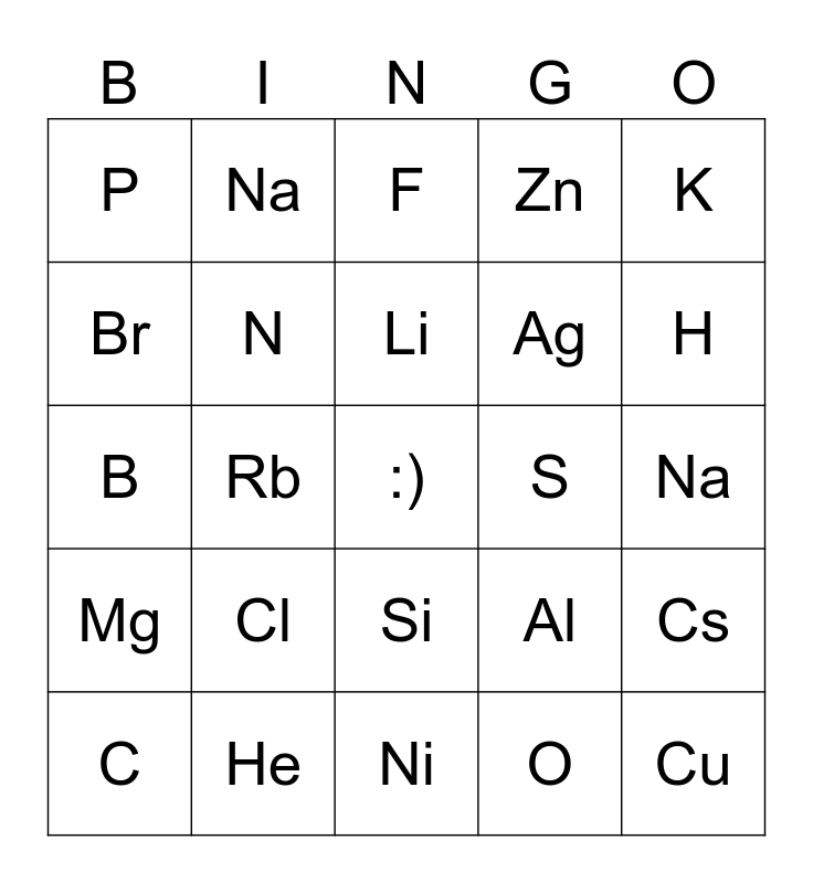 This bingo card has a free space and 34 words: Be, O, Ca, Ar, Mg, N, K, C, Na, F, Li, F, O, Ne, S, H, He, B, Cl, Al, Si, N, P, Na, Ni, Cu, Zn, Au, Ag, Br, I, Rb, Cs and Ba.
