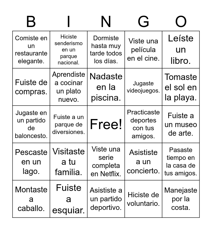 This bingo card has a free space and 24 words: Visitaste a tu familia., Fuiste a esquiar., Nadaste en la piscina., Montaste a caballo., Leíste un libro., Comiste en un restaurante elegante., Fuiste de compras., Hiciste senderismo en un parque nacional., Practicaste deportes con tus amigos., Viste una serie completa en Netflix., Jugaste videojuegos., Jugaste en un partido de baloncesto., Asististe a un concierto., Pasaste tiempo en la casa de tus amigos., Aprendiste a cocinar un plato nuevo., Hiciste de voluntario., Fuiste a un museo de arte., Dormiste hasta muy tarde todos los días., Tomaste el sol en la playa., Fuiste a un parque de diversiones., Manejaste por la costa., Pescaste en un lago., Viste una película en el cine. and Asististe a un partido deportivo..