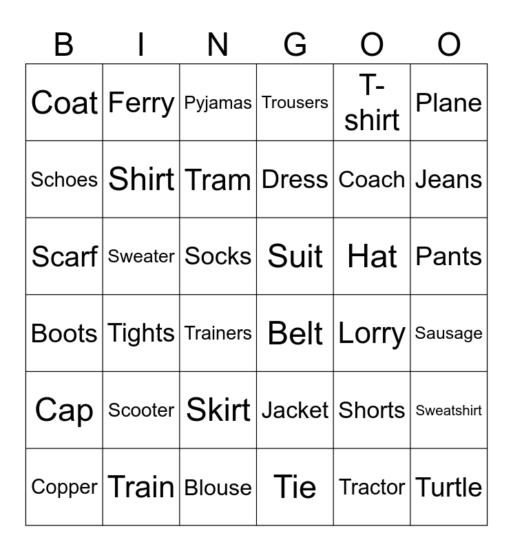 This bingo card has 36 words: Jacket, Skirt, Tie, Schoes, Boots, Suit, Shirt, Blouse, T-shirt, Shorts, Jeans, Trousers, Sweatshirt, Sweater, Dress, Coat, Cap, Hat, Scarf, Pyjamas, Socks, Tights, Belt, Trainers, Lorry, Ferry, Coach, Train, Tram, Plane, Turtle, Copper, Sausage, Pants, Scooter and Tractor.