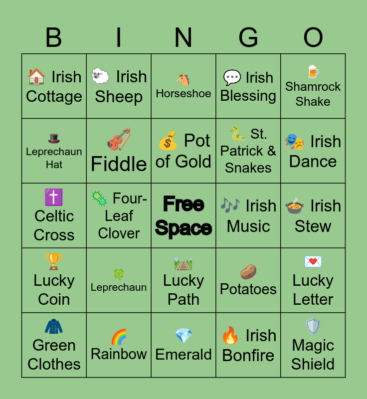 This bingo card has a free space and 24 words: 🍀 Leprechaun, 🌈 Rainbow, 💰 Pot of Gold, 🧥 Green Clothes, 🍺 Shamrock Shake, 🏠 Irish Cottage, 🎩 Leprechaun Hat, 🐑 Irish Sheep, 🎶 Irish Music, 🛤️ Lucky Path, 🐍 St. Patrick & Snakes, ✝️ Celtic Cross, 🥔 Potatoes, 💌 Lucky Letter, 🎻 Fiddle, 🔥 Irish Bonfire, 🍲 Irish Stew, 🐴 Horseshoe, 🎭 Irish Dance, 🦠 Four-Leaf Clover, 🛡️ Magic Shield, 🏆 Lucky Coin, 💬 Irish Blessing and 💎 Emerald.